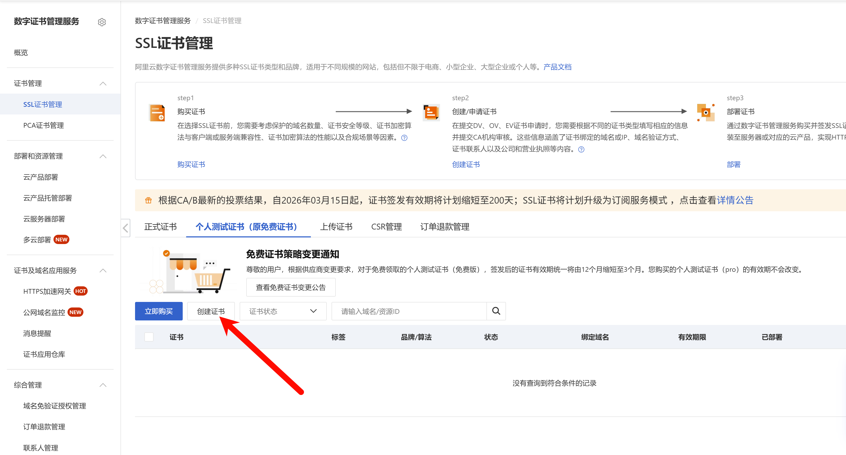 从以下路径找到免费证书申请入口,你也可以在阿里云顶部搜索框搜索SSL,也能找到。