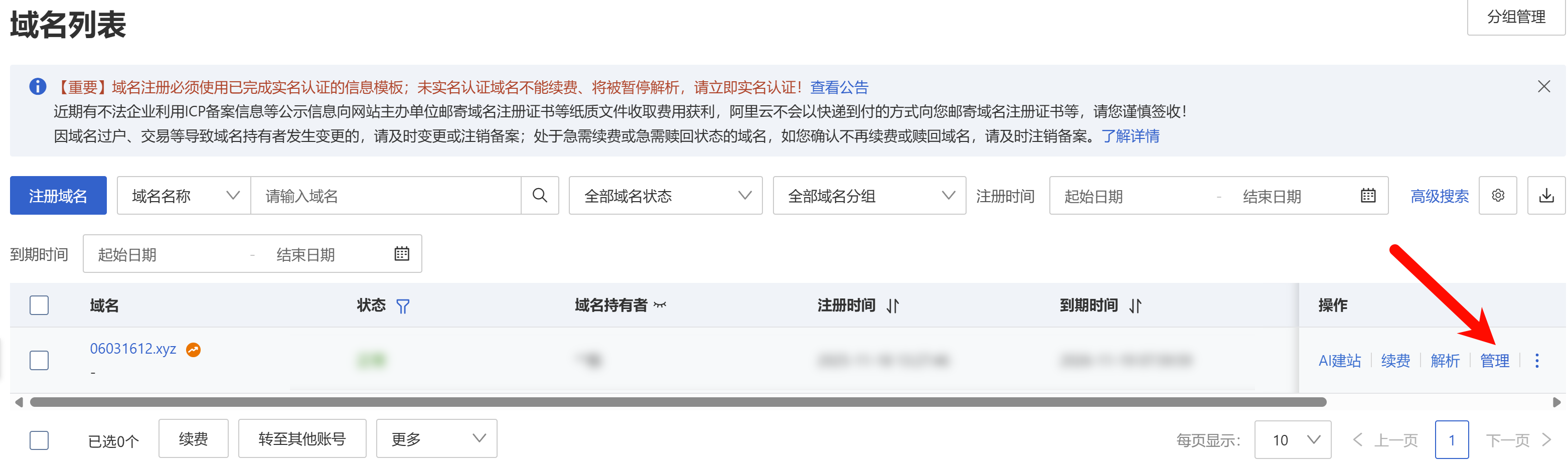 登录域名服务商,找到域名解析,添加解析记录。比如我在阿里云买的,从这里进入: